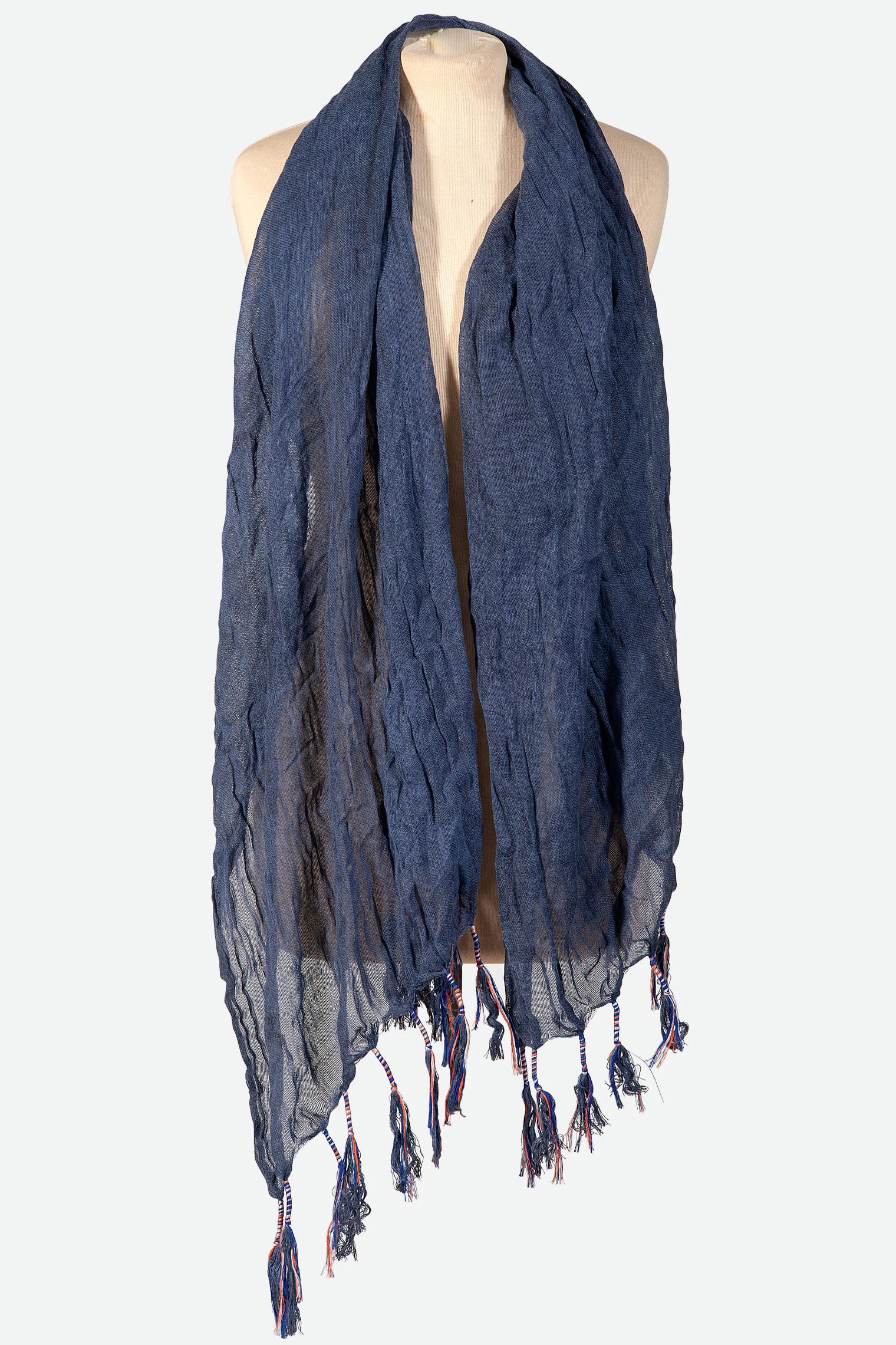 Blue scarf/sarong with colorful threads on the tassels. Dimension: 90 x 180cm